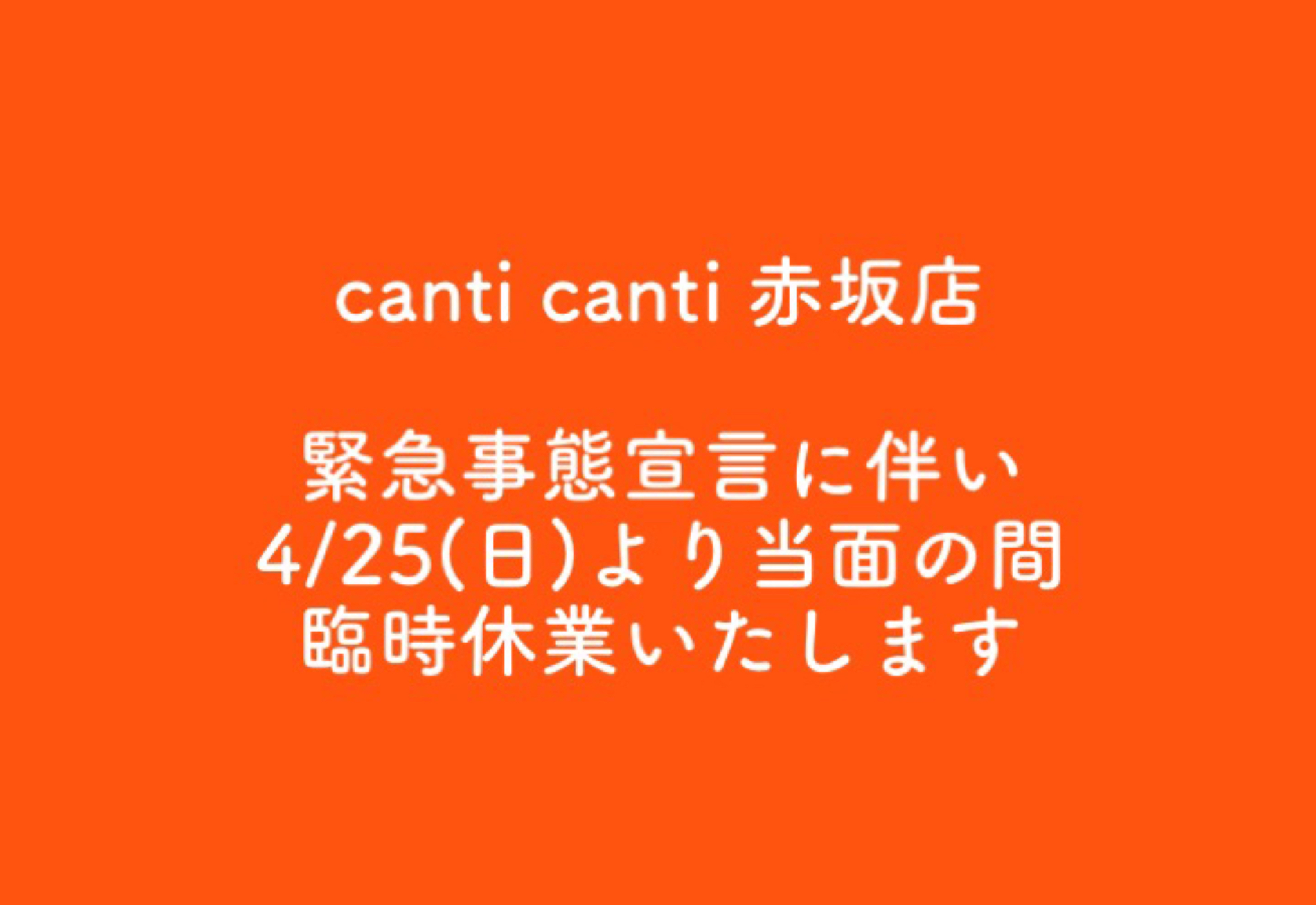 【canti canti 赤坂店 緊急事態宣言中の臨時休業のお知らせ】【canti canti 赤坂店 緊急事態宣言中の臨時休業のお知らせ】 本日4/25(日)からの緊急事態宣言発令を受け、canti canti 赤坂店当面の間全時間帯休業いたします。 変異ウイルスもはびこる日本の危機。全員の力と強い意志で、コロナ禍を終息させよう!晴れて営業再開の際にはまたお知らせいたします。それまでどうぞ皆さまお元気で安全にお過ごし下さいませ。 各種お問い合わせは canti@canticanti.com まで。