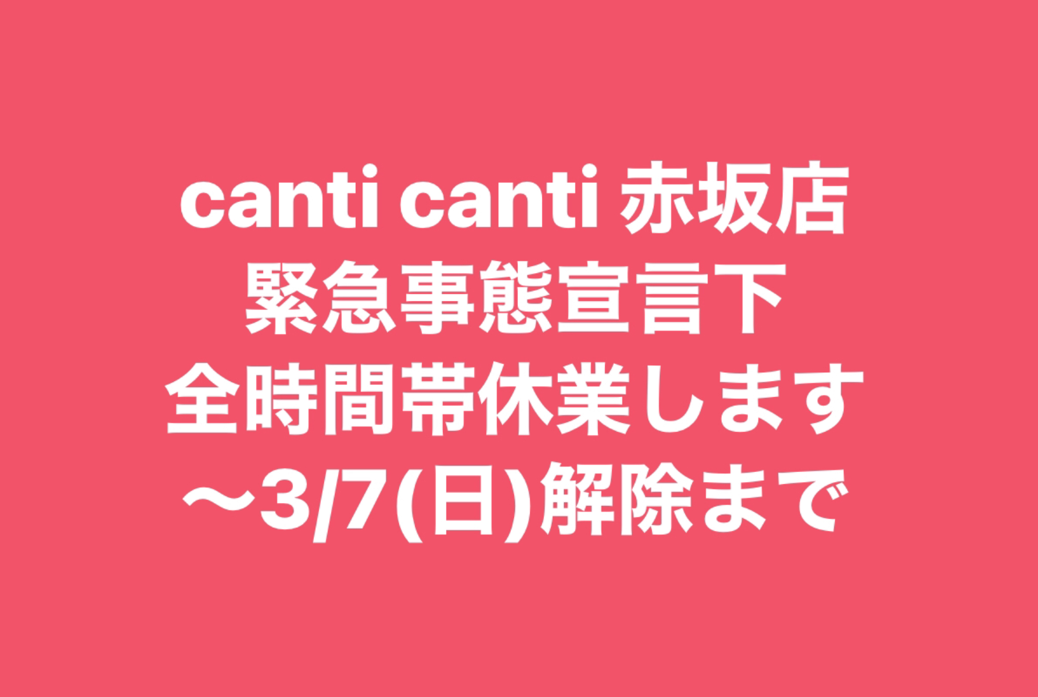 【canti canti 赤坂店 緊急事態宣言中引き続き休業します】【canti canti 赤坂店 緊急事態宣言中引き続き休業します】 緊急事態宣言の延長を受け、canti canti 赤坂店は引き続き3/21(日)までの間、全時間帯休業いたします。 三度今度こそ本気の緊急事態宣言。まだ?なぜ減らない?なぜ増える? ひたすら信じてあともう少し、canti cantiの我慢。 晴れて営業再開の際にはまたお知らせいたします。それまでどうぞ皆さまお元気で安全にお過ごし下さいませ。 各種お問い合わせは 03-6441-3260 tel. またはcanti@canticanti.com まで。