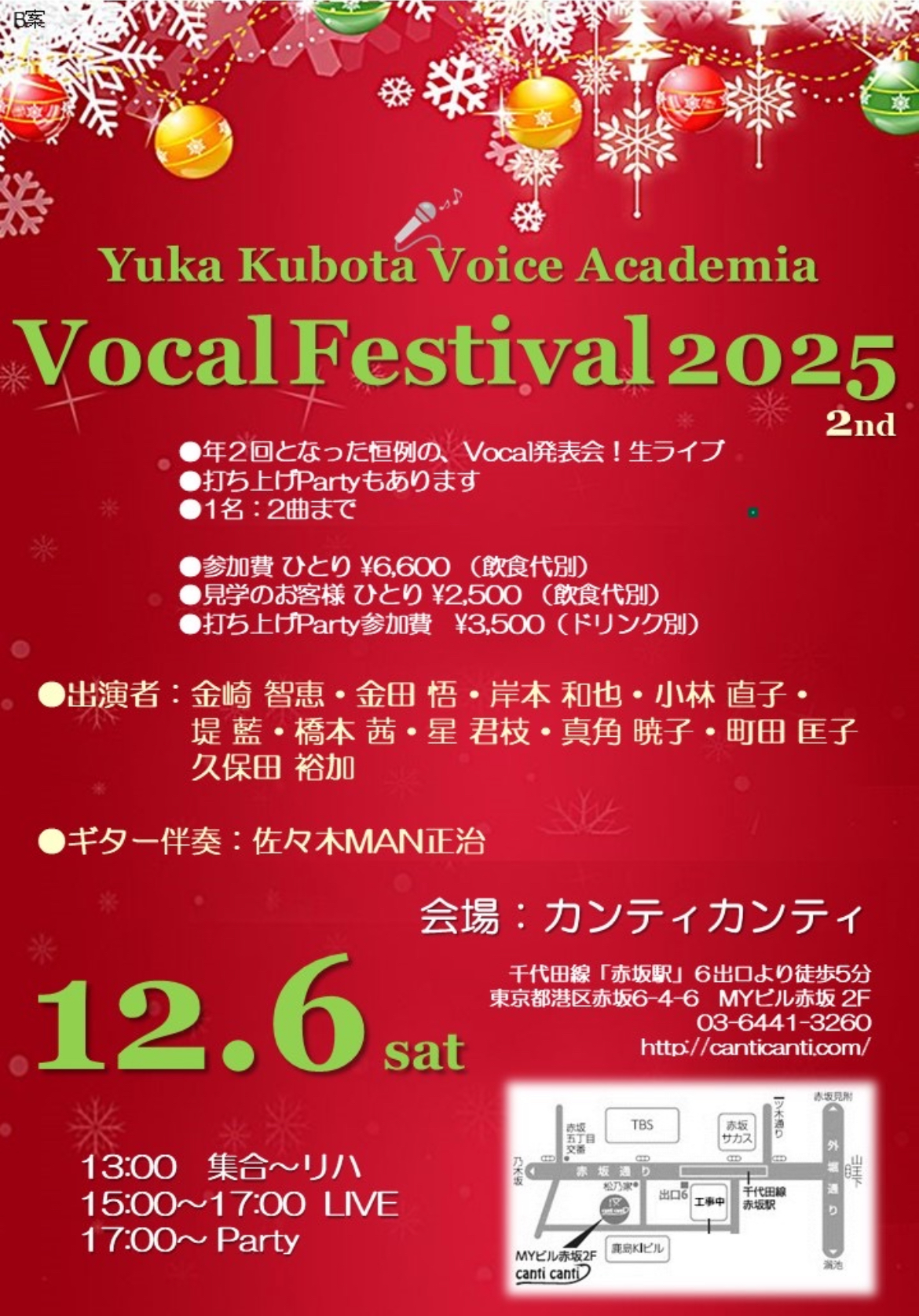 【canti canti赤坂 12/6(土) Yuka Kubota Voice Academia VOCAL FESTIVAL 2025】【canti canti赤坂 12/6(土) Yuka Kubota Voice Academia VOCAL FESTIVAL 2025】 恒例のVocal Festa 2025 2nd Stage まさにSeasonの美しい歌声に包まれるcanti canti! お楽しみくださいませ♪ 13:00 OPEN 15:00-17:00 LIVE 17:00 Party start ご見学歓迎します! Partyのご参加もどうぞお気軽にご予約くださいませ canti@canticanti.com こちらまで
